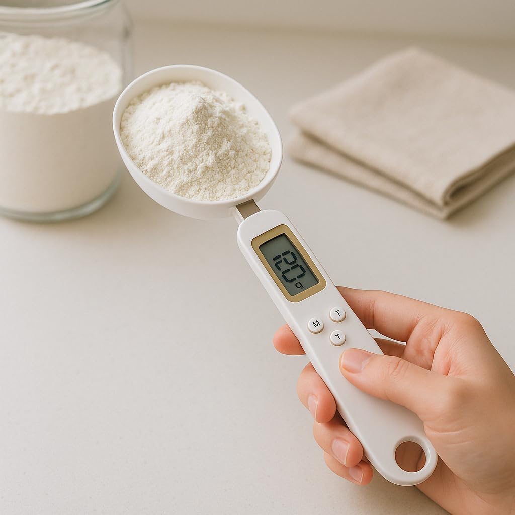 Dica de Uso: Para máxima precisão, mantenha a colher na posição horizontal durante a pesagem e evite tocar no copo da colher com as mãos.